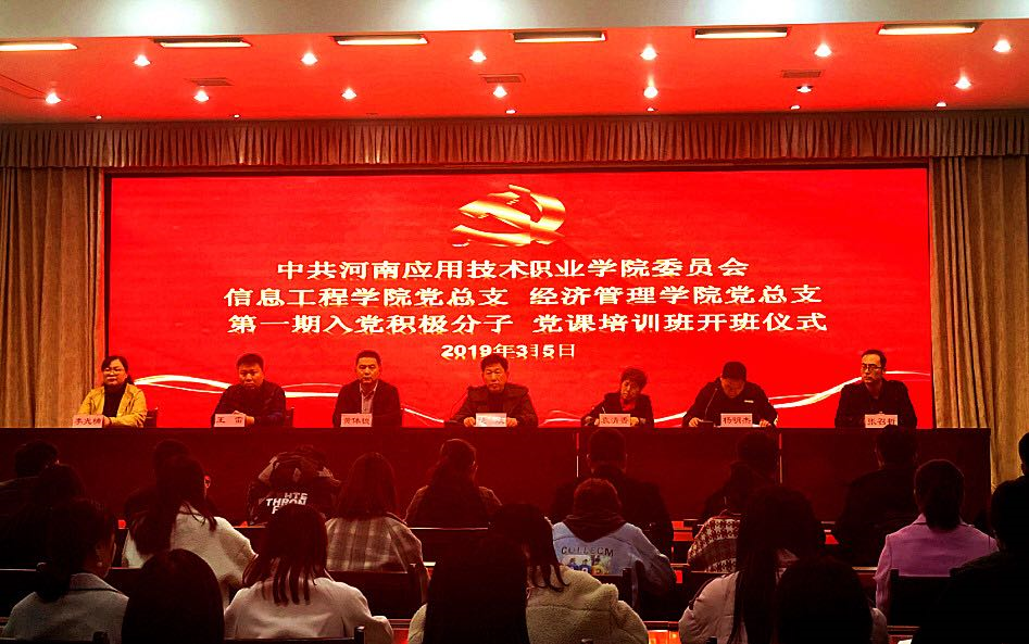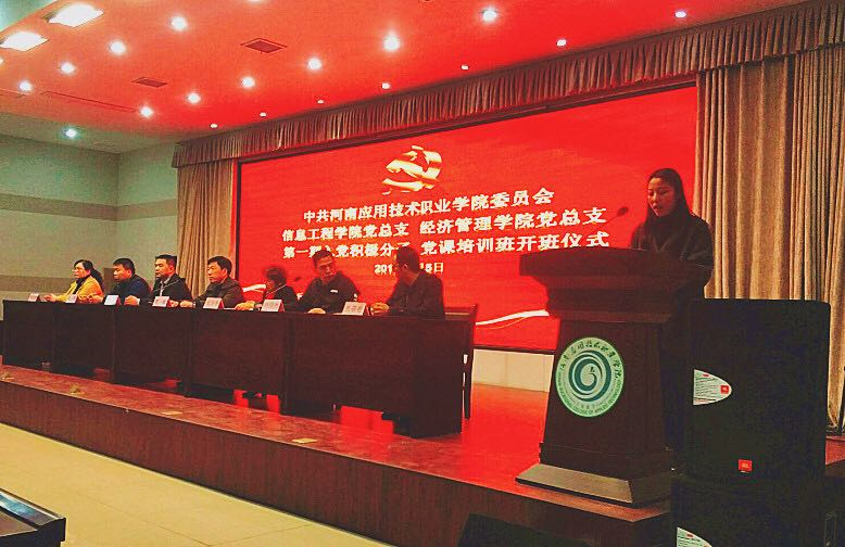2019年3月5日下午,信息工程学院党总支、经济管理学院党总支第一期入党积极分子党课培训班开班仪式在实训楼二楼会议室隆重举行。两总支书记及全体支委委员、本期入党积极分子出席大会。信息工程学院党总支副书记杨明杰主持大会。大会开始,杨明杰书记宣读了此次培训班的具体通知,随后,信息工程学院刘雅迪同学代表本次培训班学员发言。