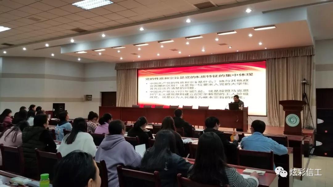 第一课结束后,信息工程学院张振平老师又给我们开讲了第二课:《党的性质和宗旨》,首先他给学员们讲述了自己对党的认识,让学员们观看了5分钟的短视频,使学员们了解到近代以来国家艰苦卓绝的发展历程。随后张老师以历史事实为依据讲解了党的性质和宗旨,内容充实而深刻,极具思想性。他的一言一行,对每一位学员的思想都起到了无可比拟的导向作用。同时让同学们了解到了入党的流程与条件,党的先进性,党员的先进性,党员的模范带头作用,党的纪律,方针政策等,使入党积极分子更加了解在大学阶段如何做,如何开展和积极支持党的工作,如何树立踏实肯干的工作作风,如何服务同学,为党性修养的提高奠定坚实的基础。