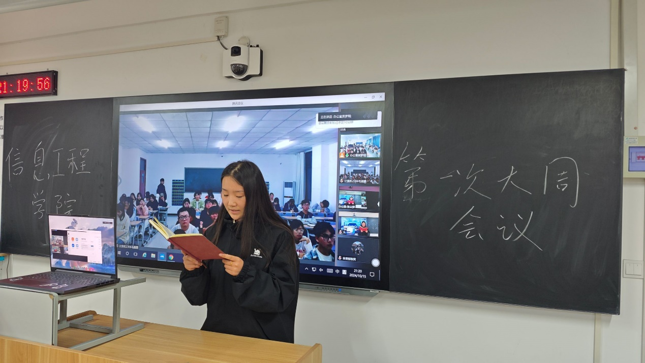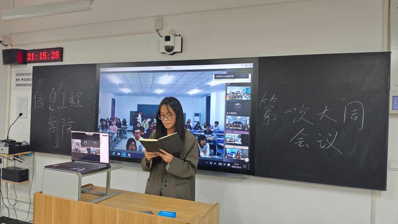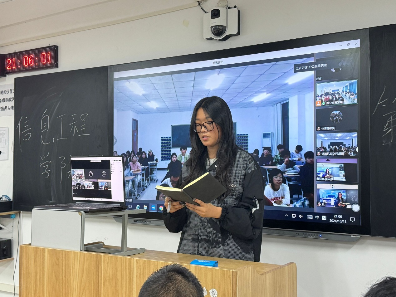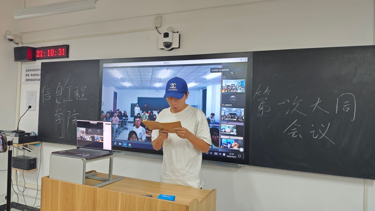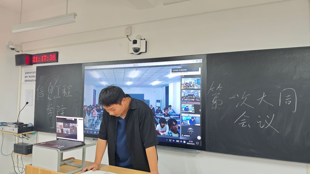 博观而约取,厚积而薄发。为有序推进学生会工作开展,提高学生会成员综合素养,帮助新成员尽快融入学生会大家庭,2024年10月15日晚,信息工程学院于开封校区F410开展学生会周例会,郑州校区于教室SC302同步开展线上会议,团总支书记冷月、学工办主任常昆、23级主席团、各部门部长、副部长及23级部员、24级部员参会。