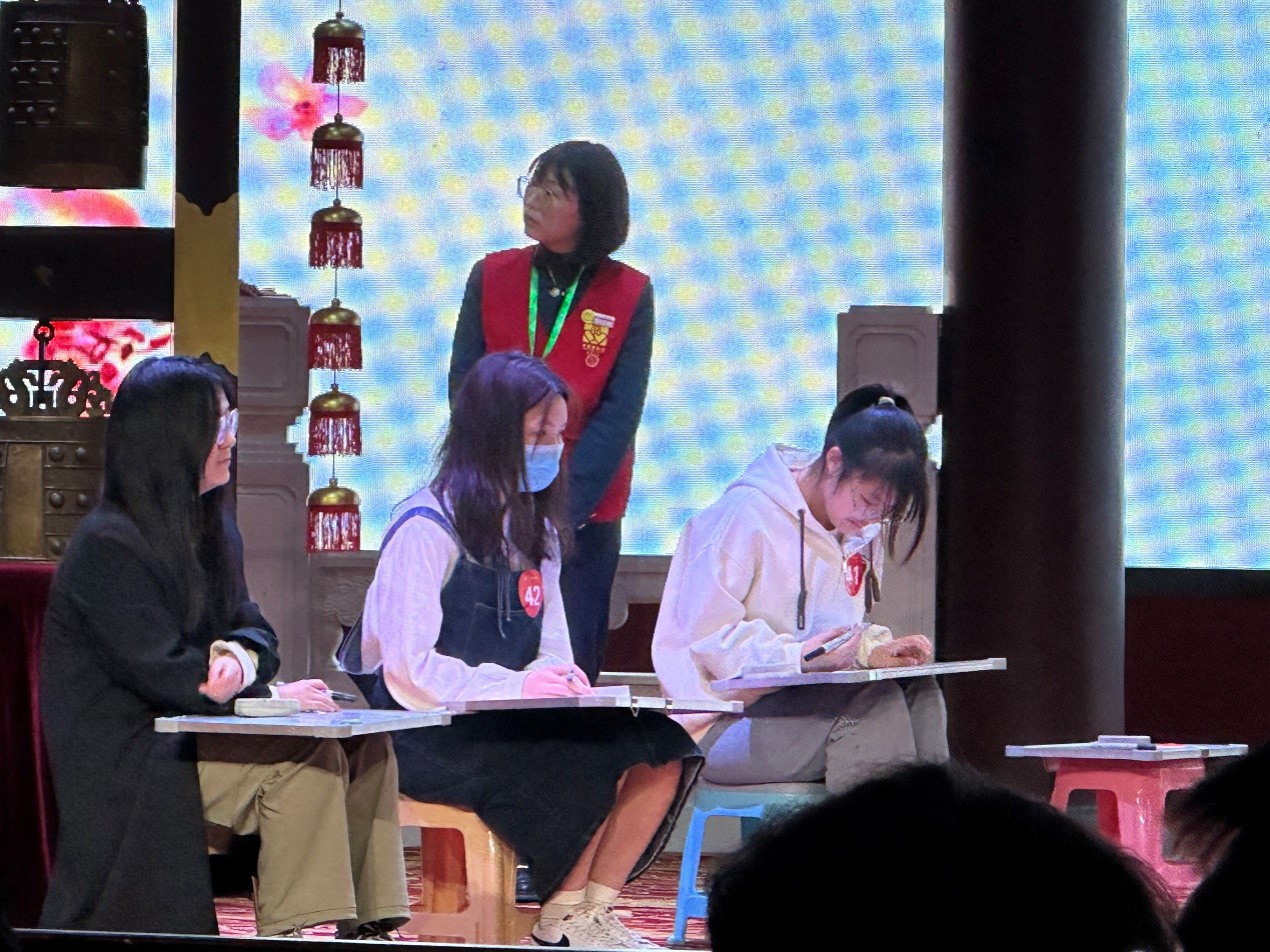 诗词大会分为“题板答题、飞花令、看图飞花令”三个篇章。赛中,我院选手镇定自信、机智作答,经过几轮激烈比拼,共有7名同学顺利进入半决赛,在“飞花令”大战中,比赛更是精彩绝伦,选手们对答你来我往、互不示弱,现场高潮迭起、掌声不断。