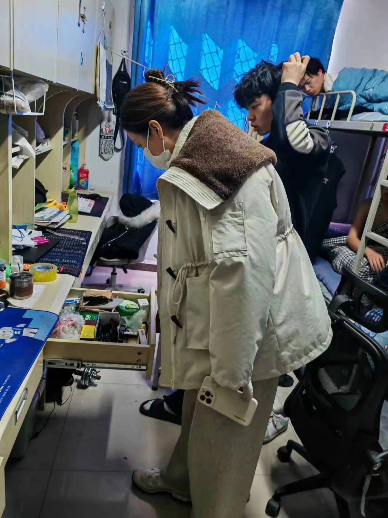 检查过程中,辅导员们就宿舍的消防安全、用电安全、卫生状况等情况进行了全面细致的排查,并重点检查了宿舍楼内的灭火器是否齐全有效,消防通道是否畅通无阻,电器使用是否合规安全等情况,并多次向同学们强调消防安全的重要性。同时,针对学生在日常生活中容易忽视的细节,如插座使用、电线摆放、电器使用等问题,给予了具体的要求和安全用电指导,并对发现的问题,进行及时记录和整改。此外,辅导员还特别叮嘱了寝室的卫生要保持清洁和床铺整理等方面要求,督促学生自觉维护宿舍的整洁和卫生,共同营造一个舒适的学习环境。