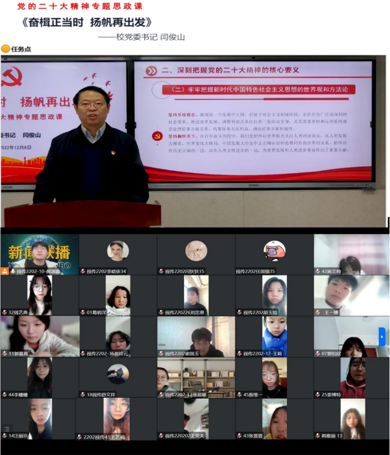 专题思政课上,党委书记闫俊山从“充分认识党的二十大召开的伟大历史意义”、“深刻把握党的二十大精神核心要义”、“汇聚青春力量,争做时代新人”三个方面展开了讲述。学习贯彻党的二十大精神是当前全校师生的重大政治任务,把党的二十大精神融入高校思政课,是将高校思政课教学优势转化为学生的爱国情、强国志、报国行,激励大学生从非凡的奋斗征程中汲取奋进力量。同学们纷纷表示,通过党的二十大精神专题思政课学习,深刻理解了党的二十大精神内涵要义,强化了责任担当,要坚定不移听党话、跟党走,立志做有理想、敢担当、能吃苦、肯奋斗的新时代大学生,为全面建设社会主义现代化国家、全面推进中华民族伟大复兴贡献青春智慧。