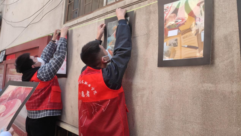 画展现场,信息工程学院志愿服务团队在社区工作人员的帮助下,按照各自分工,有条不紊地开始布置工作。我院志愿者主动、耐心地为前来参观的社区群众讲解作品中所传达的精神含义,宣传、弘扬雷锋艰苦朴素、助人为乐的大爱情怀,在春天播下雷锋精神的种子,让其生根发芽,发扬光大。