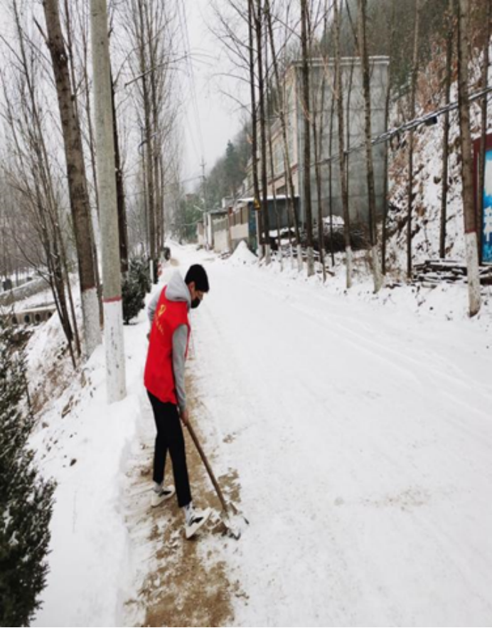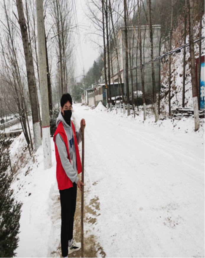 2022年1月22日,河南应用技术职业学院信息工程学院计算机2104的武靖皓同学,由于这几天连续降雪,为了防止路面结冰,他积极响应当地村民委员会号召,主动拿起扫把清扫地面积雪。在疫情防控的同时也保证了大家的出行安全,用自己的坚守与奉献温暖了冬日。