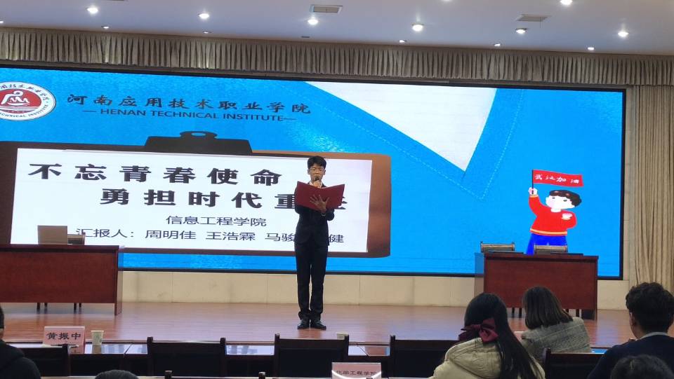 为了深入学习贯彻习近平新时代中国特色社会主义思想和党的十九大精神,号召同学们争做新时代新青年,为实现青春梦、中国梦而奋斗,现结合思想政治理论课堂教学,河南应用技术职业学院于11月24日开展“弘扬抗疫精神,做好新时代青年”为主题的成果展示大赛。信息工程学院马骏,周明佳,黄健,王浩霖四名同学参加本次大赛。
