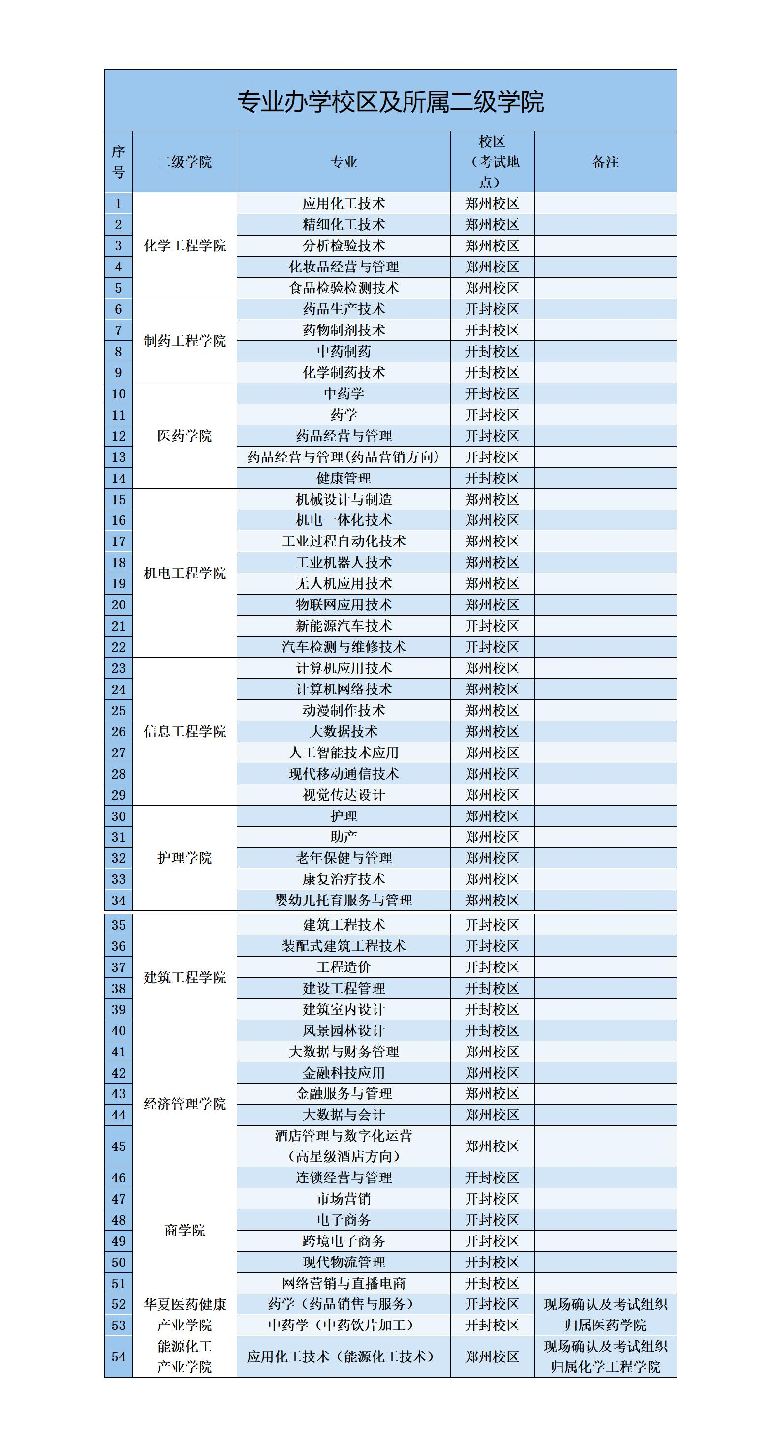 说明:为便于组织考试,学校以考生第一志愿专业所在办学校区作为考生考试地点,并由第一志愿专业所属二级学院具体组织考生现场确认及参加考试。专业办学校区及所属学院相关信息参见附表,供考生对照查询了解。