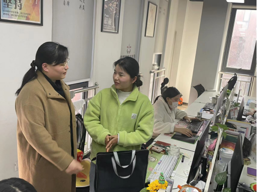 随后,崔琳看望了在梧桐花已经工作了三年之久的我院2018级优秀毕业生屠金凤、曾婉婷,询问在公司的具体工作岗位、工作情况及薪资待遇等,赠与其笔记本等物品进行慰问,并邀请两位同学近期有时间来学校为学弟学妹们做专场报告,分享工作经验,提升同学们的就业信心,为更好的实习和就业做好充分准备。