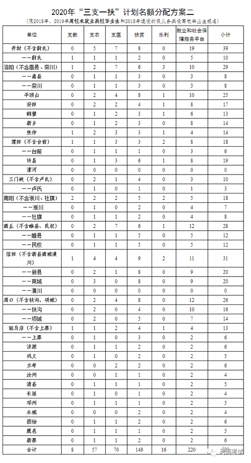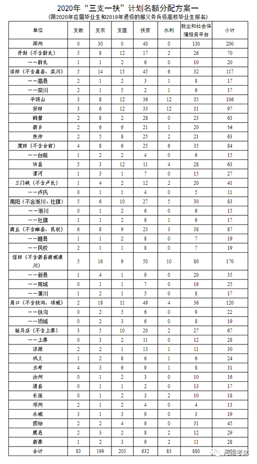 省“三支一扶”工作协调管理办公室(以下简称“三支一扶”办)于2020年6月29日在河南省人力资源和社会保障厅官网“三支一扶”专栏、河南省毕业生就业信息网发布招募公告及招募岗位计划。