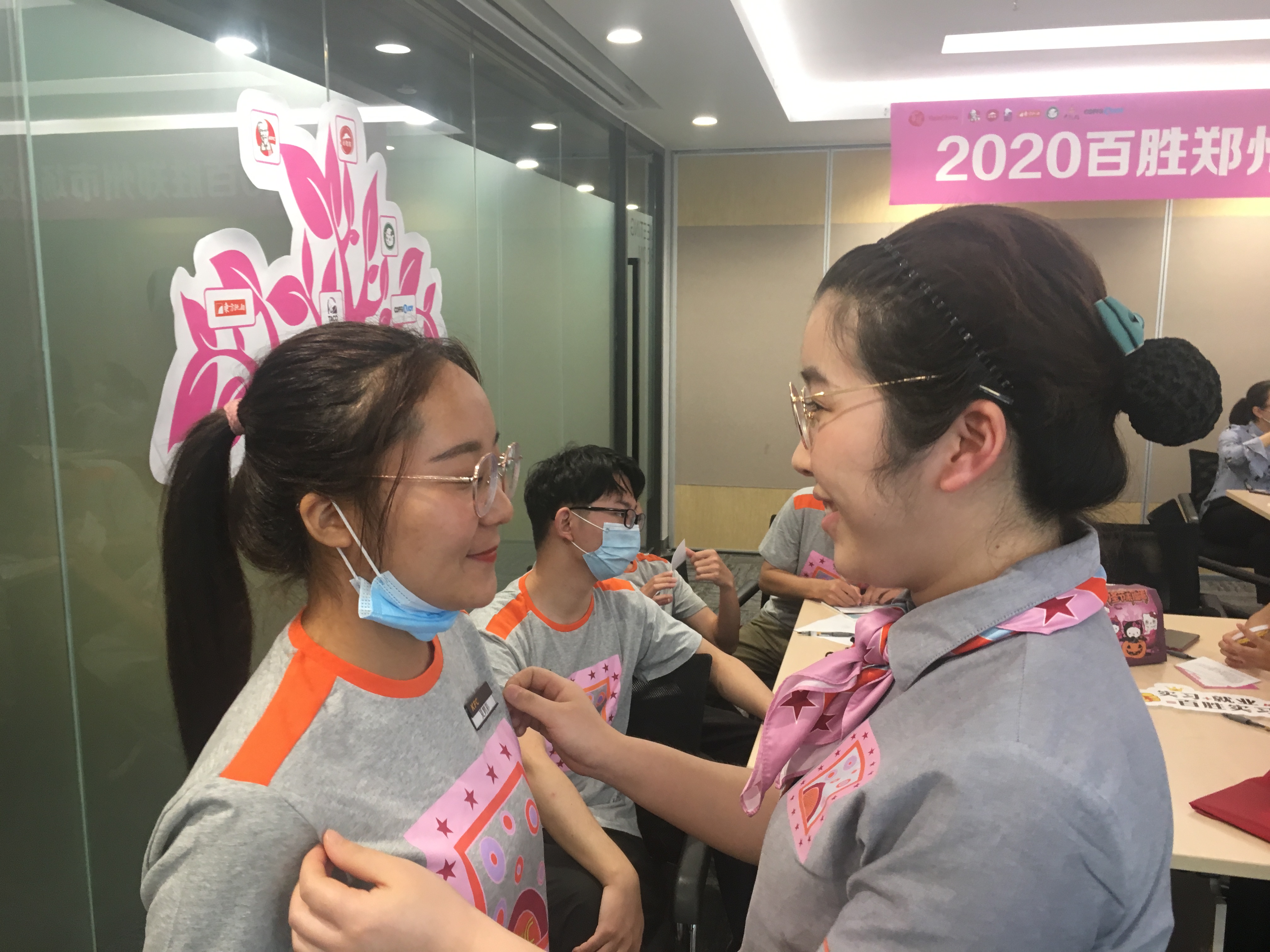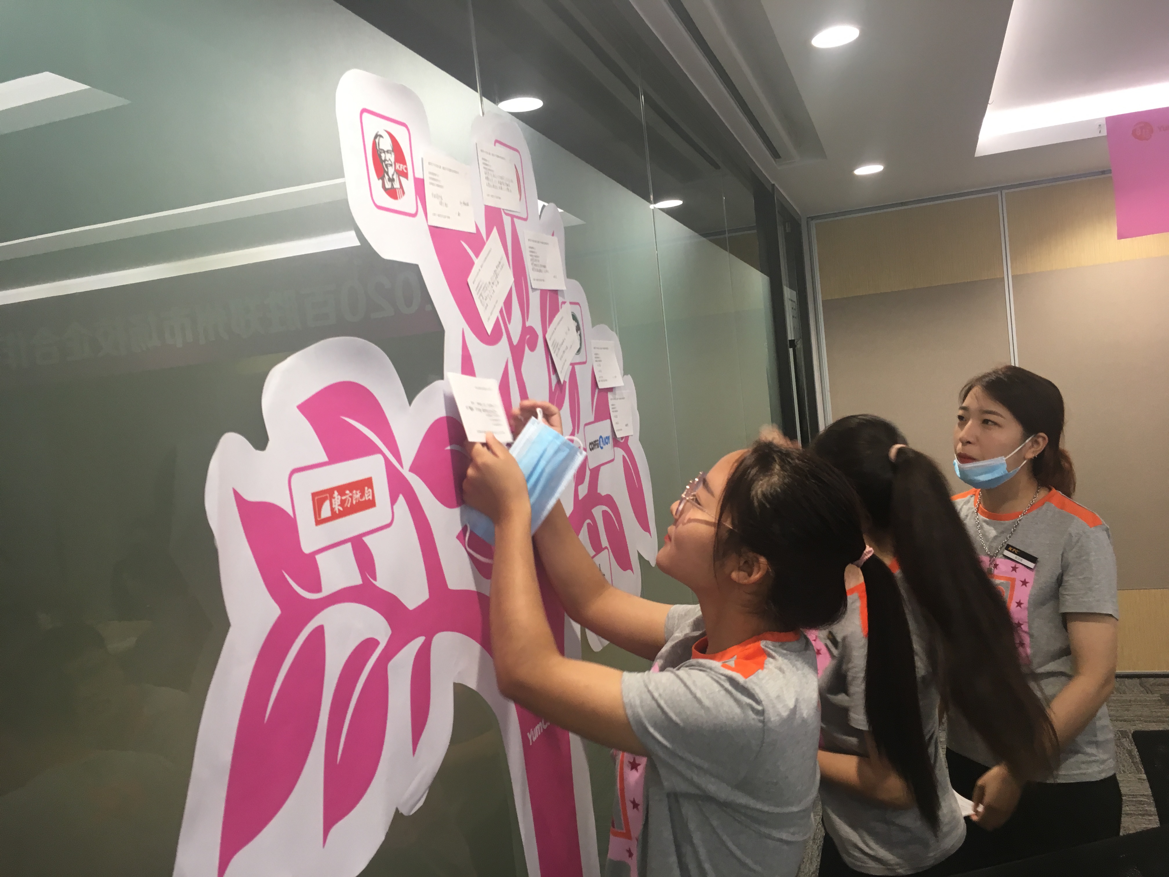 最后,颇有仪式感的环节到了。每位同学都领到了一个专属大礼包,写下自己的职业心愿贴到许愿墙上,并由各店的店长亲自为同学们佩戴名牌,从此正式成为“肯德基”人。