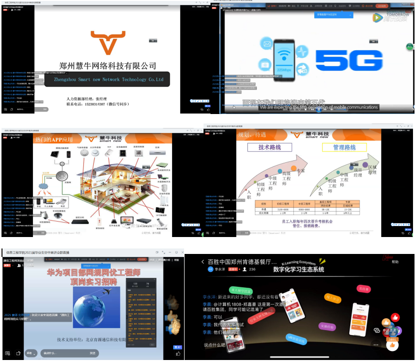 自信息工程学院”空中宣讲会“首秀后,同学们求职热情逐渐升温,近两日。我们邀请了4家企业为同学们连续直播,涉及“网络通信”、“电子商务”、“餐饮零售”三个板块。郑州慧牛网络科技有限公司网络商务经理张经理、北京育源通信科技有限公司河南区域负责人姜泽、无线网规网优高级工程师杨鑫兴、浙江智谷电子商务有限公司人事经理刘其超、百胜中国郑州肯德基有限公司招募主管,校企合作项目负责人李永洋应邀为同学们带来内容丰富的空中宣讲会,学院2018级700余名学生通过钉钉直播参与其中。