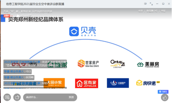 自信息工程学院推出”空中双选会“以来,全院2018级学生积极参与,累计投递简历近1500份。为了丰富”空中双选会“形式,给广大同学提供更广阔的平台,我院继续推出”空中宣讲会“。2020年5月15日晚,河南贝壳信息技术有限公司河南总部校园招聘部招聘经理李经理,京东方杰恩特喜科技有限公司招聘经理裴经理应邀为同学们开启首场”空中双选会,学院2018级700余名学生通过钉钉直播参与其中。