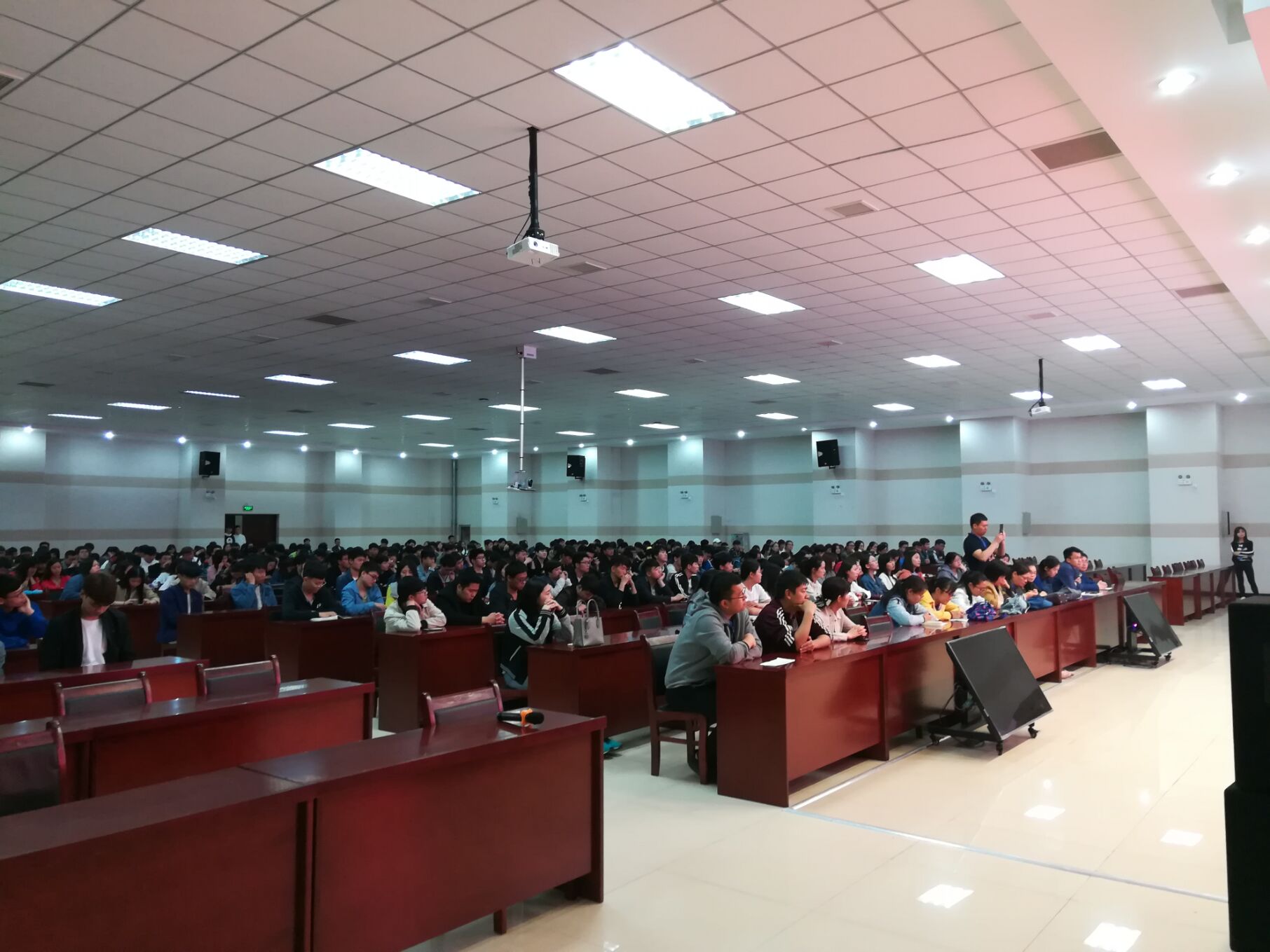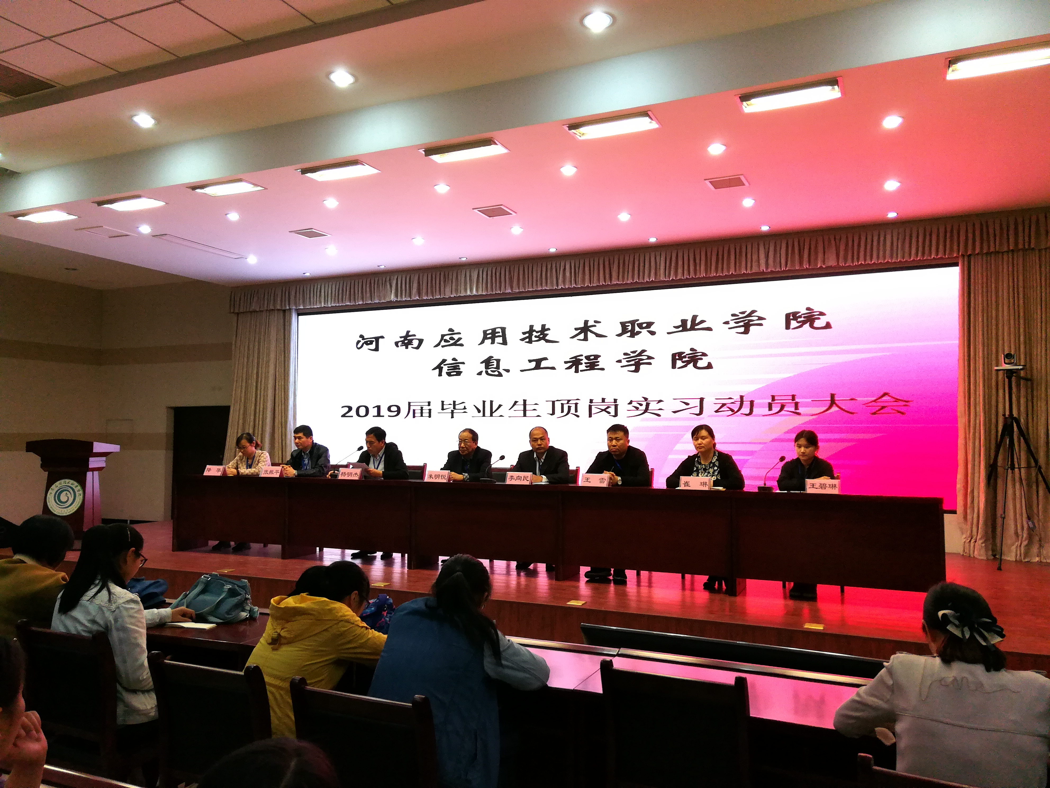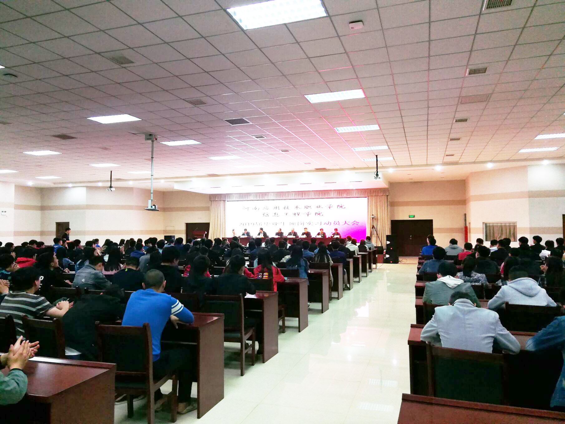 4月25日下午五点三十分,信息工程学院19届毕业生顶岗实习动员大会在实训楼二楼会议室顺利召开。参加本次会议的有信息工程学院院长王雷、副院长崔琳、信息工程学院党总支书记杨明杰、教务处处长朱明悦、就业创业指导中心主任李向民、计算机网络教研室主任张振平、艺术教研室主任降华等全体信息工程学院教师及2019届全体毕业生。